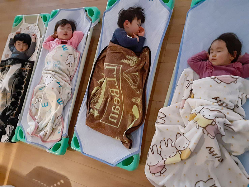 お昼寝コットを使用します。(シーツと上掛けはご用意いただきます)